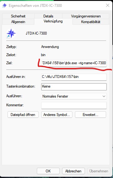 • Wie gesagt, nicht vergessen, dass die Shortcuts angepasst werden müssen. Der Pfad zum JTDX muss angepasst werden und die Endung "Rigname" muss für das jeweilge Funkgerät angepasst werden.